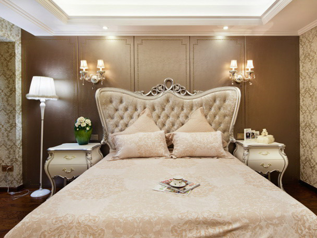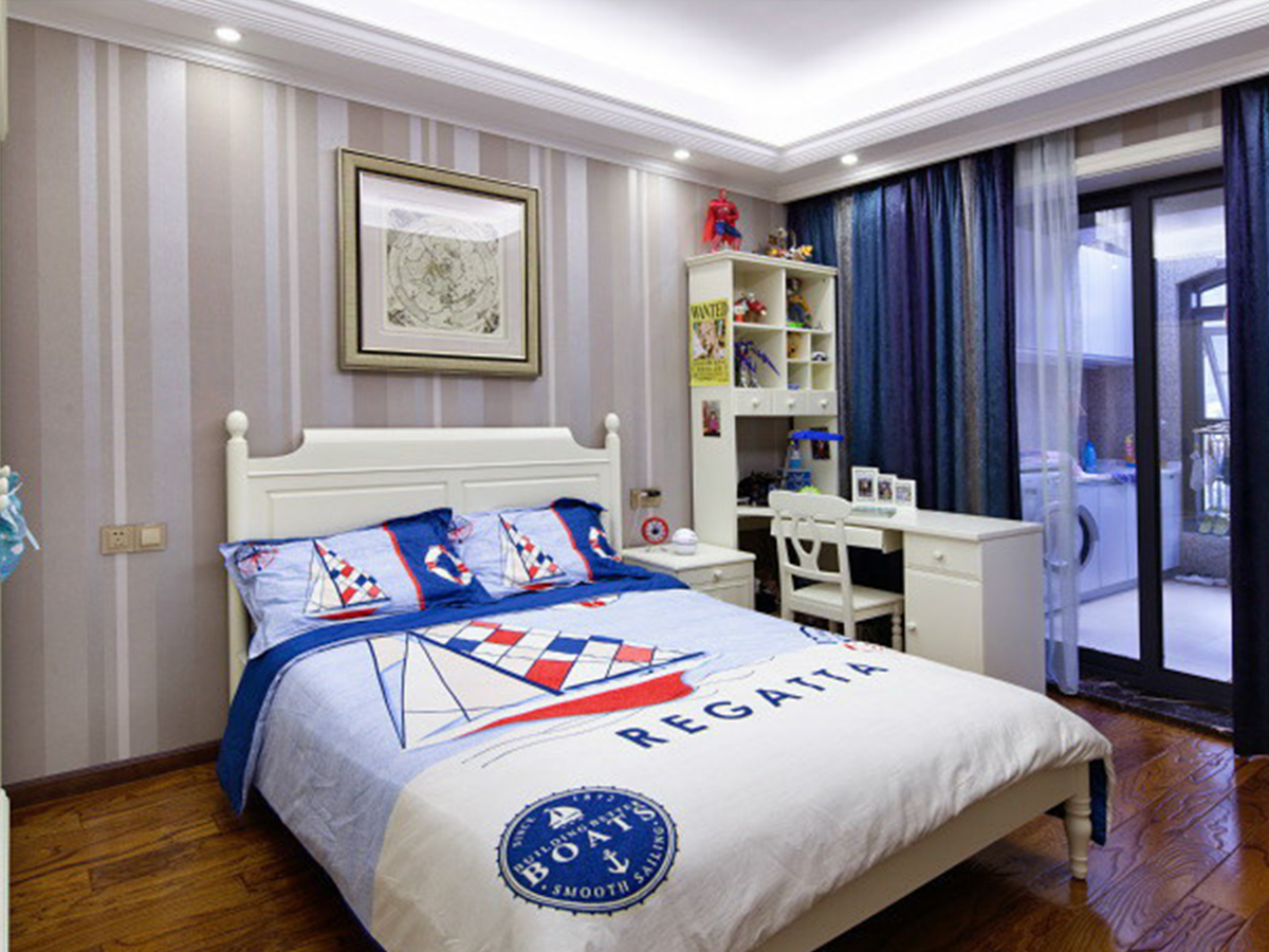 因為整體的設計歸與簡潔明快,所以在客廳的這個空間區域中我運用了對比的手法,讓沙發和電視柜的顏色形成對比,視覺空間拉開,頂面石膏線的運用,使空間變得更富有層次。在主臥室的設計中我采用了暖色的木地板搭配皮質硬包的床頭背景墻,使房間具有溫馨的整體感覺