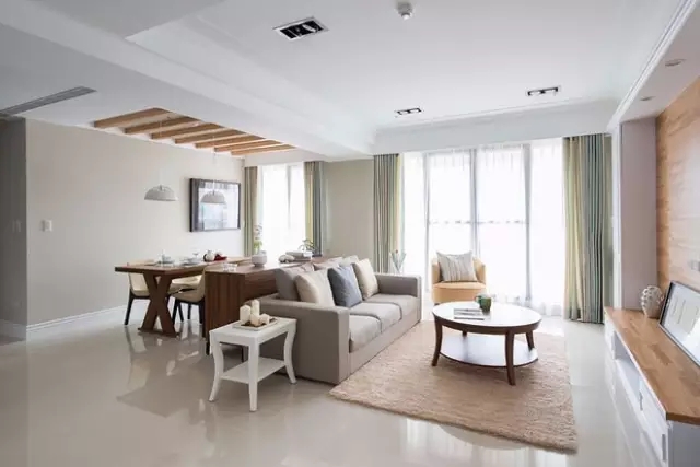 開放式餐廳盡量靠著廚房,最好在客、餐廳中間保留一定的距離,如果客、餐廳太近,那么大家吃飯的時候,油污什么的很容易弄到沙發等家具上,不易清洗,特別是家里有孩子的哦。