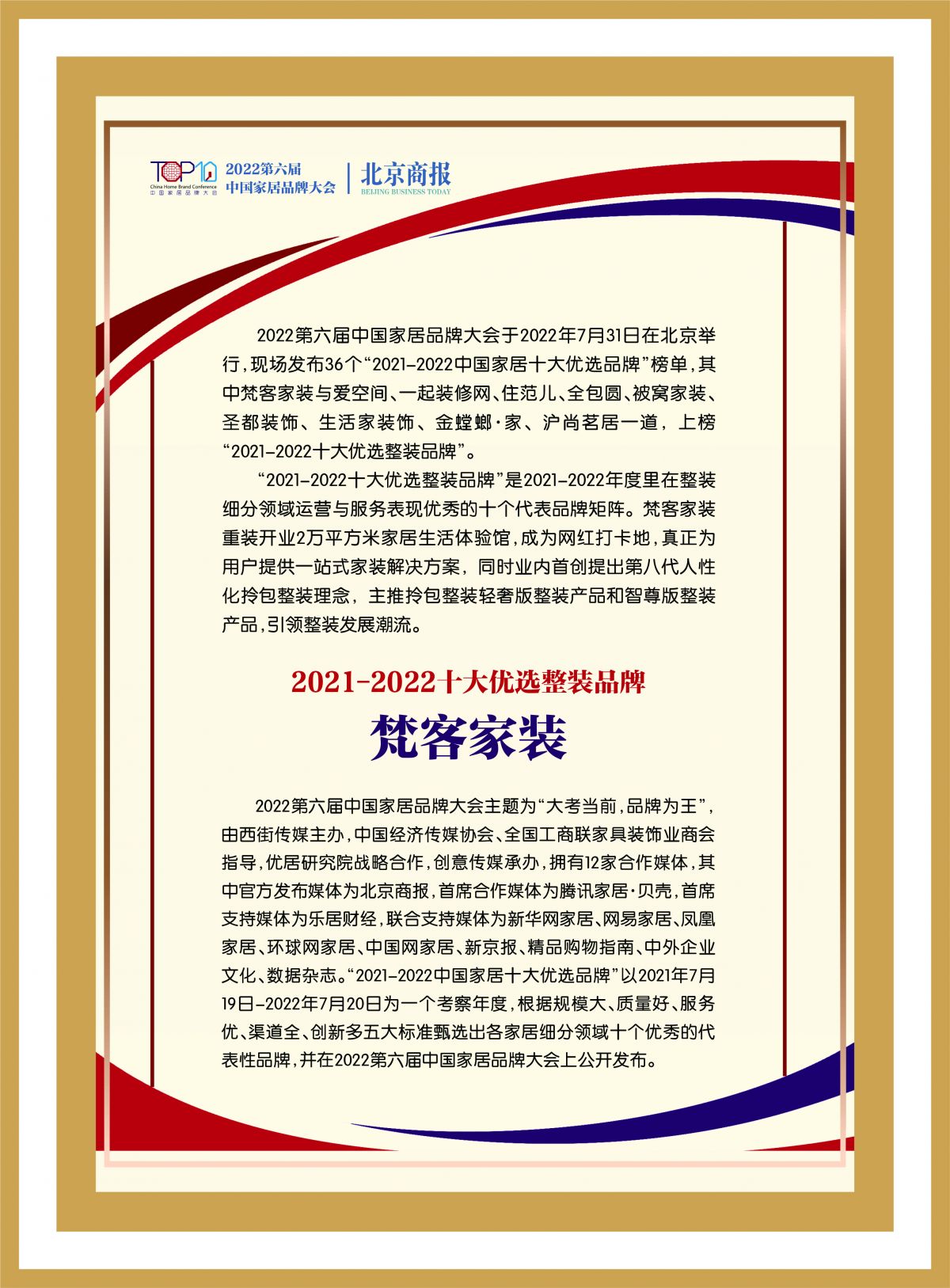 2022年第六屆中國(guó)家居品牌大會(huì)在京舉行,梵客家裝憑借【整裝細(xì)分領(lǐng)域運(yùn)營(yíng)與服務(wù)表現(xiàn)優(yōu)秀】,被權(quán)威媒體力薦,上榜“2021-2022十大優(yōu)選整裝品牌”。