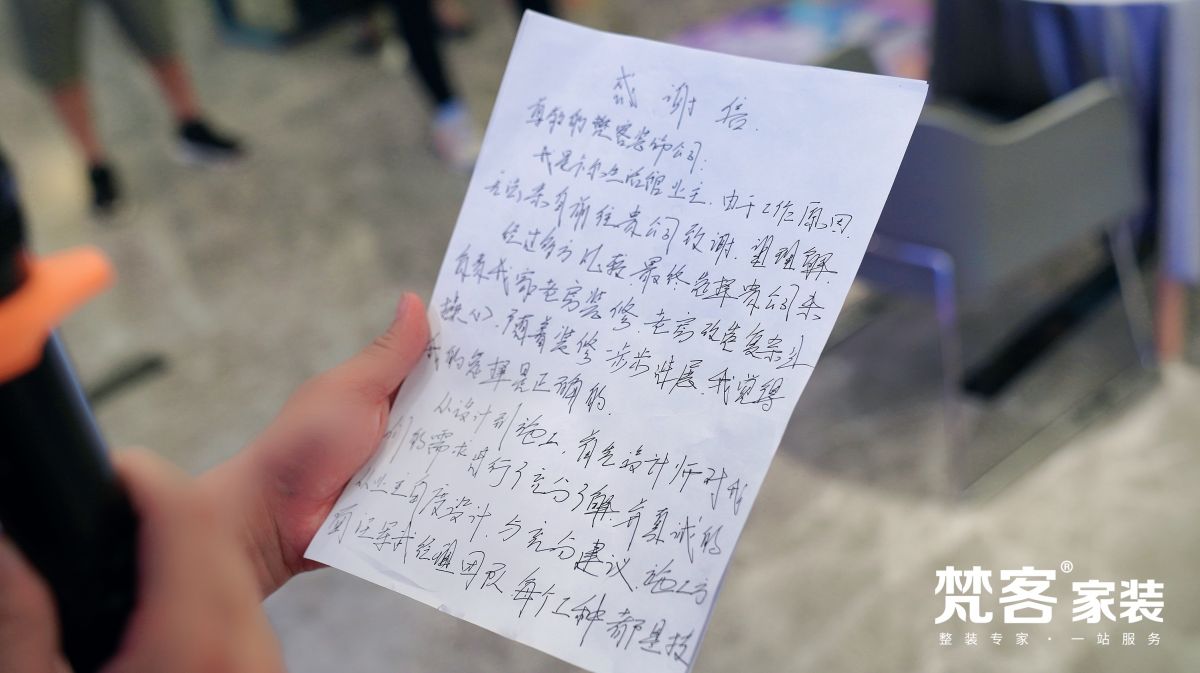 裝修完的業(yè)主朋友專程來(lái)梵客送上錦旗,手寫(xiě)感謝信,一筆一劃都是誠(chéng)懇。贊揚(yáng)梵客服務(wù)好、工藝精湛、技術(shù)過(guò)硬,對(duì)新家非常滿意,對(duì)設(shè)計(jì)師、工長(zhǎng)等也表示感謝。