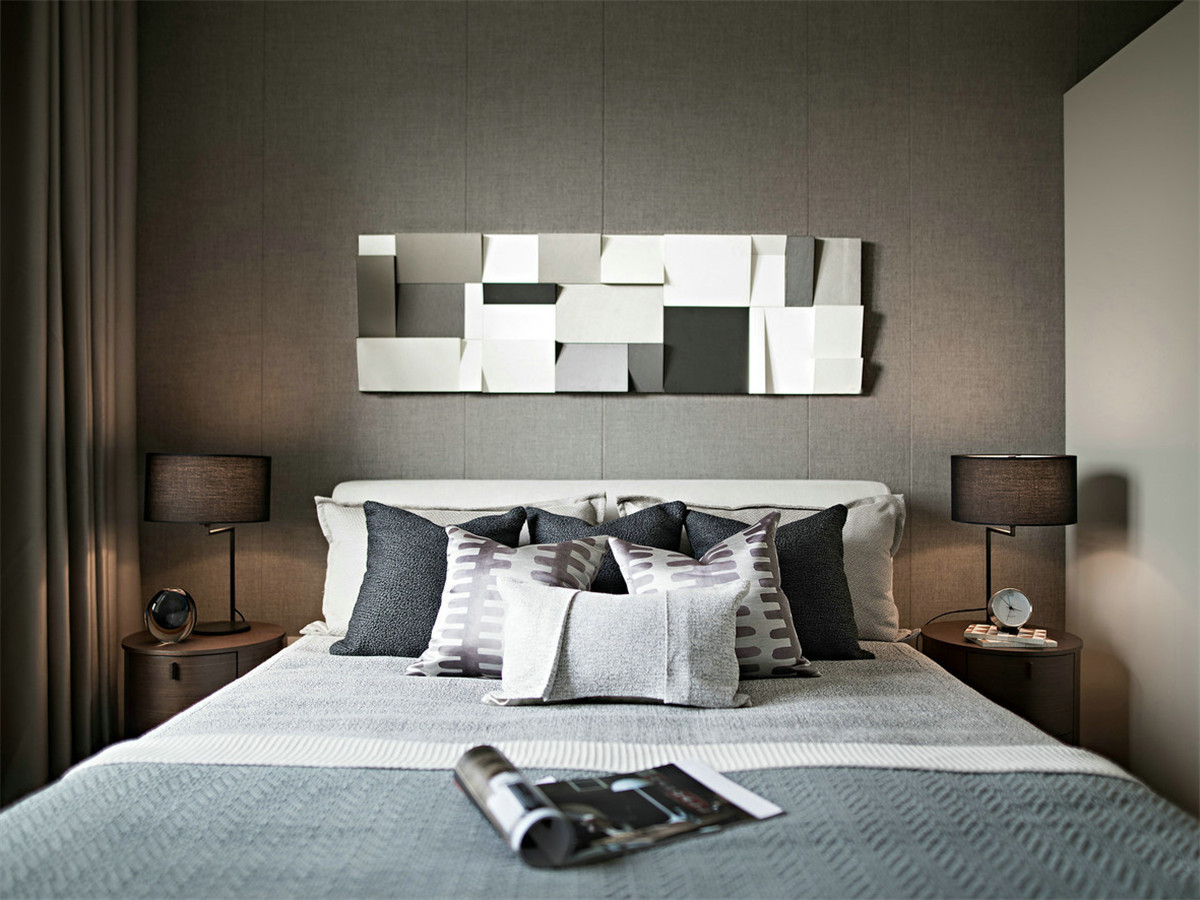 主臥的設計主要是圍繞著都市風尚,整個空間凸顯品位與現(xiàn)代感,飾物的造型干凈利落,灰色調高貴雅致,深淺不一的抱枕增加了空間層次感。整個臥室都顯得柔軟舒適。